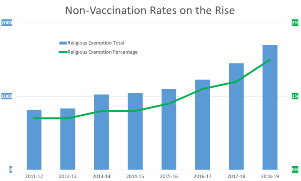 - 1 in every 300 students were able to claim religious exemption in the last year, and why 80 of the state’s 100 counties had an increase in those claims since 2011 (Editorial Board 2019). You can directly view this increase in Figure 1 below.
